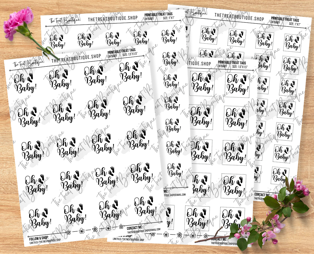 "Oh Baby" treat tags 1.5"x1.5" and 1"x1" sheets. Perfect for cake pops, cookies, cupcakes, and gifts.