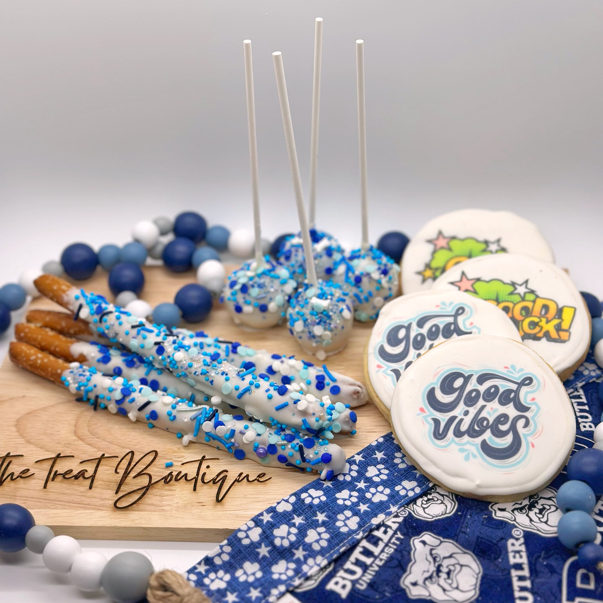 Extra cake pops, dipped pretzel rods, and iced sugar cookies can be added to the treat box for an additional fee. No substitutions.